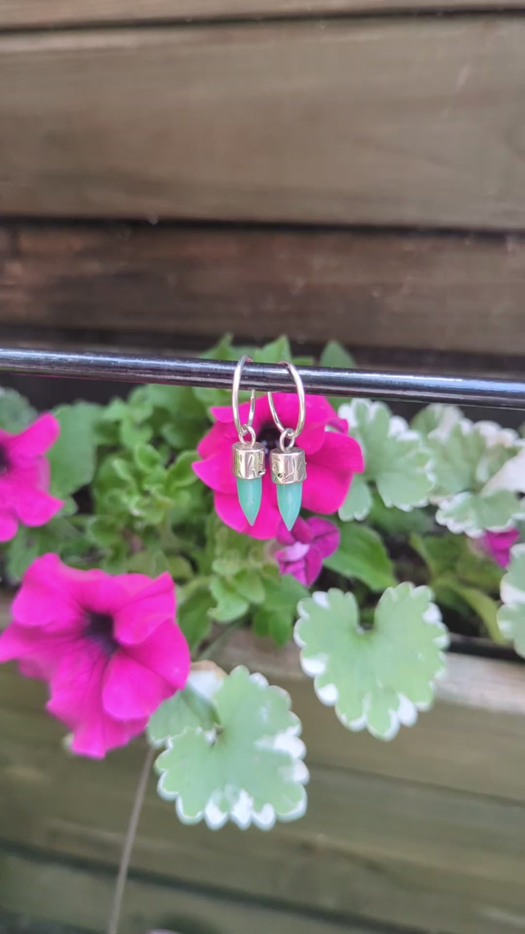 Radiate calm confidence with these Chrysoprase Bullet Crystal Earrings, hanging gracefully from sterling silver hoops. Each vibrant green crystal point drops 3.5cm, exuding fresh, uplifting energy — like a breath of spring for your spirit.