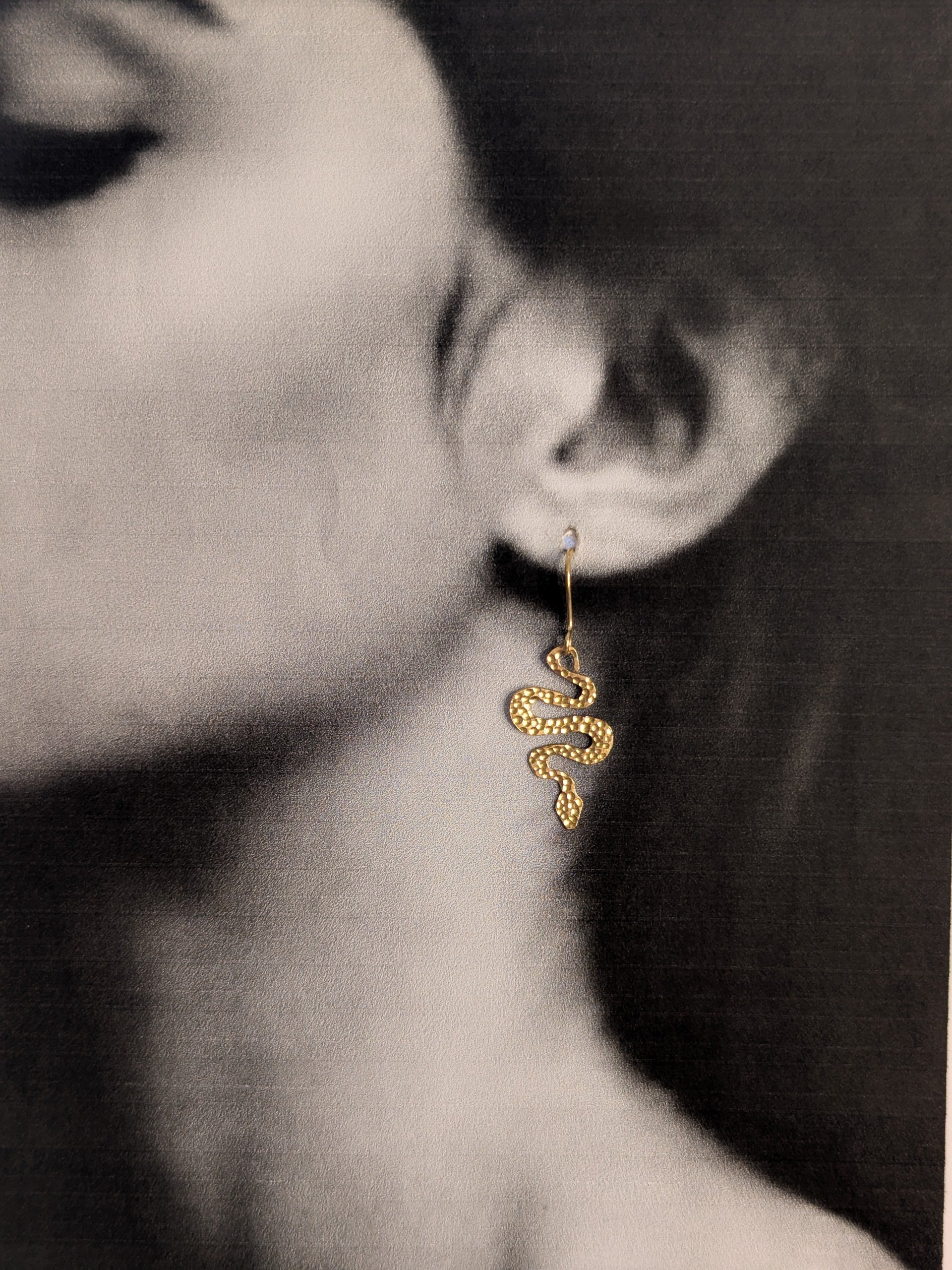 Channel mystical power and timeless style with these enchanting gold brass snake earrings. Each serpent is hand-finished with a hammered texture that shimmers in the light, giving these earrings a bold yet elegant edge.