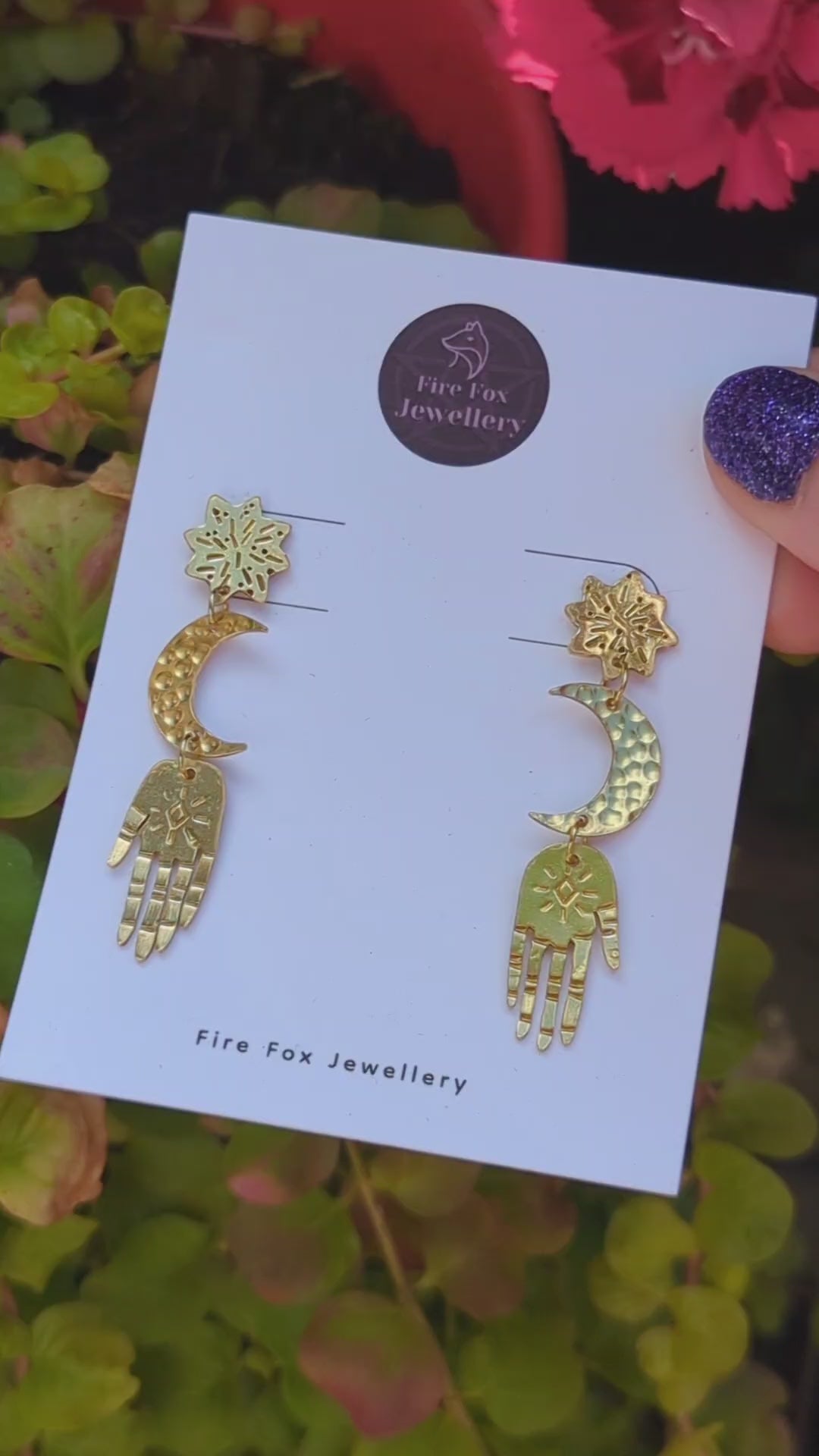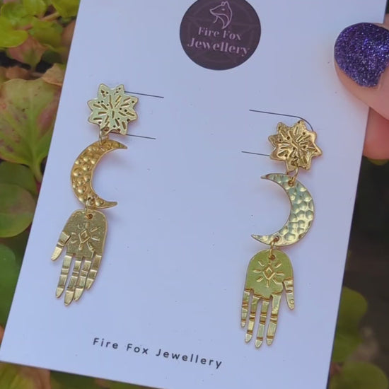 Each piece is hand-cut from raw gold brass, featuring a star stud, a crescent moon, and a protective hand delicately dangling below. These powerful symbols are more than decorative — they carry intention:
